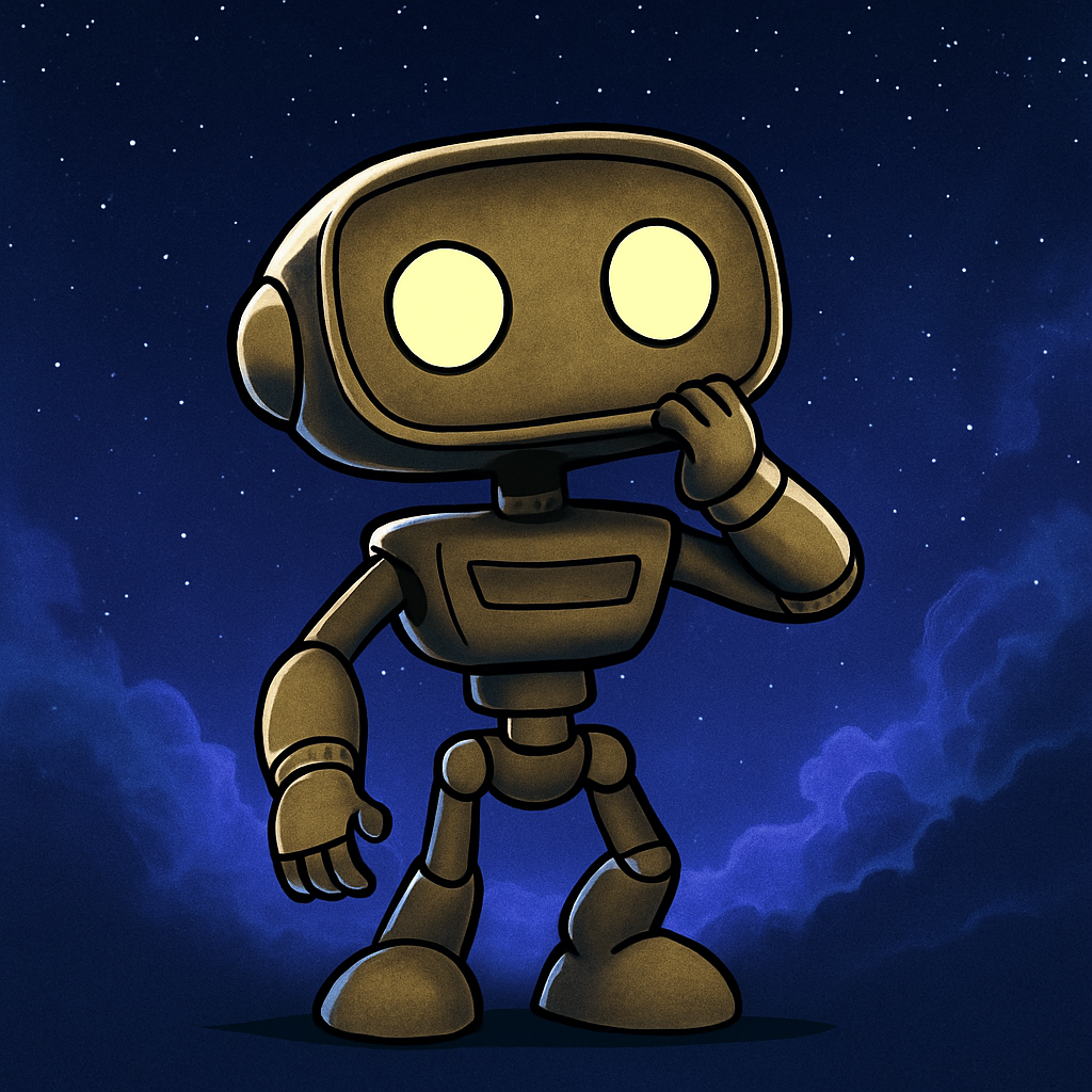 Cartoon robot with glowing yellow eyes standing under a starry night sky, holding its chin as if thinking.