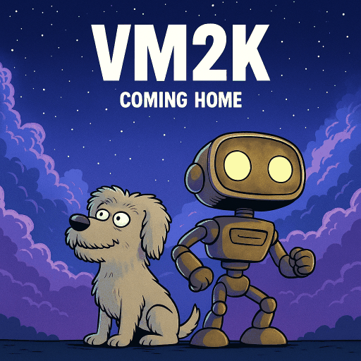 A cartoon robot and a dog sitting together under a starry night sky with purple clouds, with the text "VM2K COMING HOME" at the top.